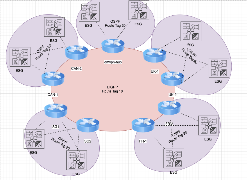 This week has been centered all around DMVPN & VMWare NSX. Earlier in the week , I was addressing an issues with routing loops observed . In the deployment I have two spokes in Canada that are Cisco 6504-E devices. The control plane for EIGRP come up with neighborships between the Hub and Spokes. Routes are passed from the Spokes down the ESG in the local envrionment , however data plane traffic is not successful. I see traffic leave the ESG and hit the local edge and then die. When I remove the encryption map. The traffic routes successfully.