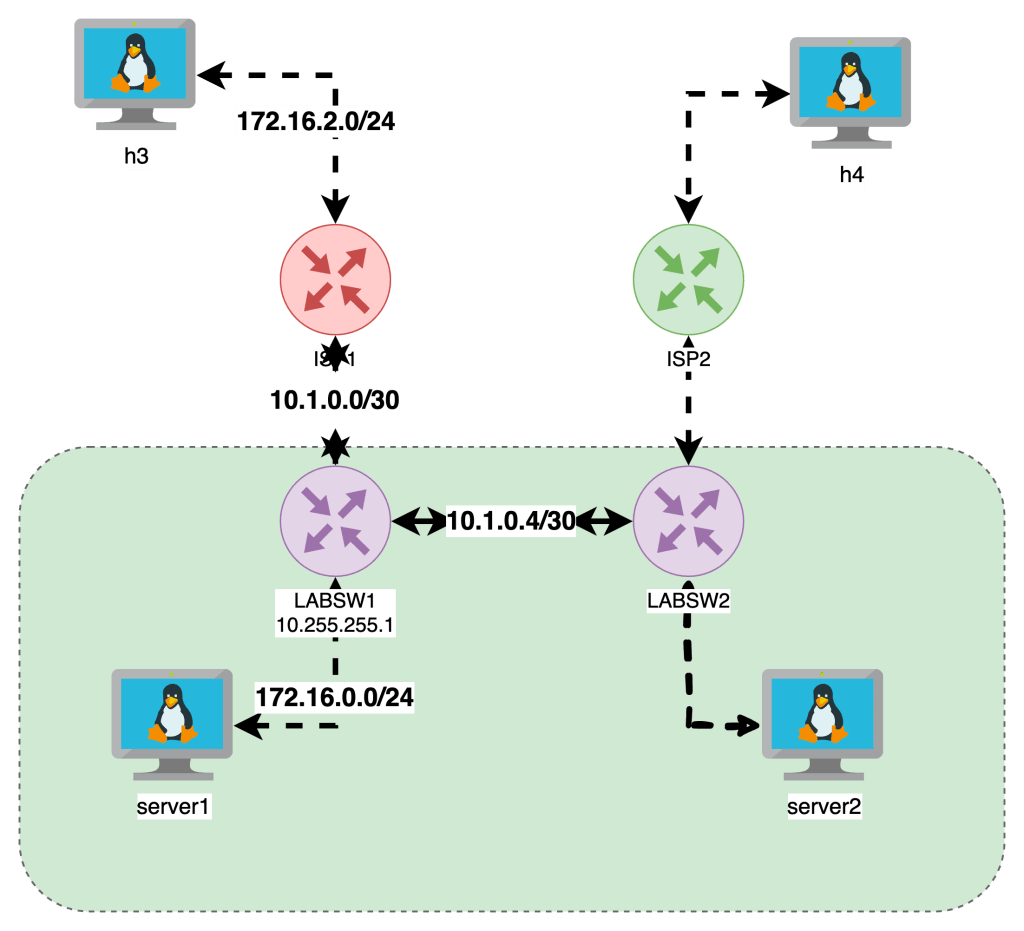 The last idea I want to share is that not every tables has every chain since the purposes vary on the context. Last item is lets look at some examples, lets start with a topology from Netlab We are going to focus on the left side of the diagram Servers H3 and Server1 are running Ubuntu with IPTables enforcement. Devices ISP1 and LABSW1 are running FRR BGP and act as routers in this build