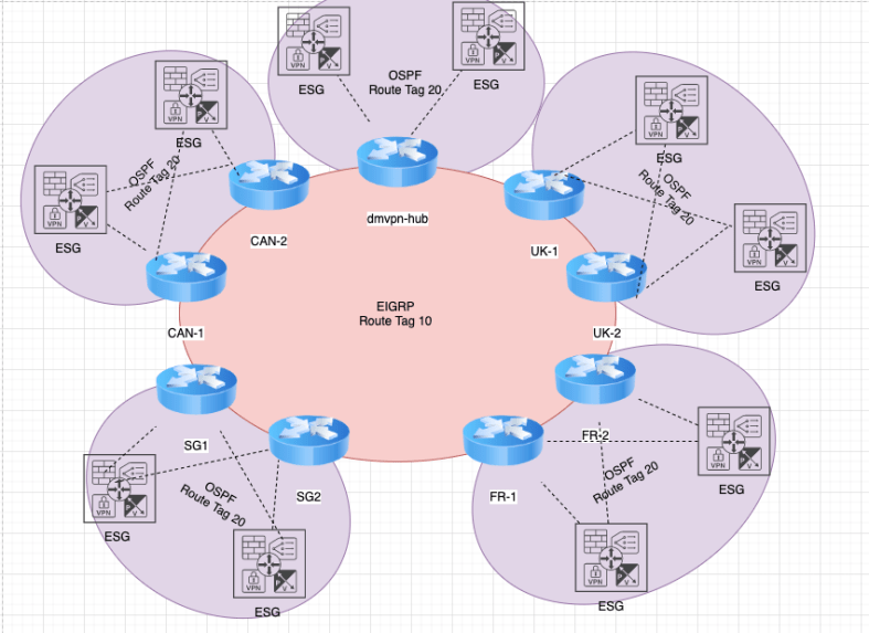 This week has been centered all around DMVPN & VMWare NSX. Earlier in the week , I was addressing an issues with routing loops observed . In the deployment I have two spokes in Canada that are Cisco 6504-E devices. The control plane for EIGRP come up with neighborships between the Hub and Spokes. Routes are passed from the Spokes down the ESG in the local envrionment , however data plane traffic is not successful. I see traffic leave the ESG and hit the local edge and then die. When I remove the encryption map. The traffic routes successfully.